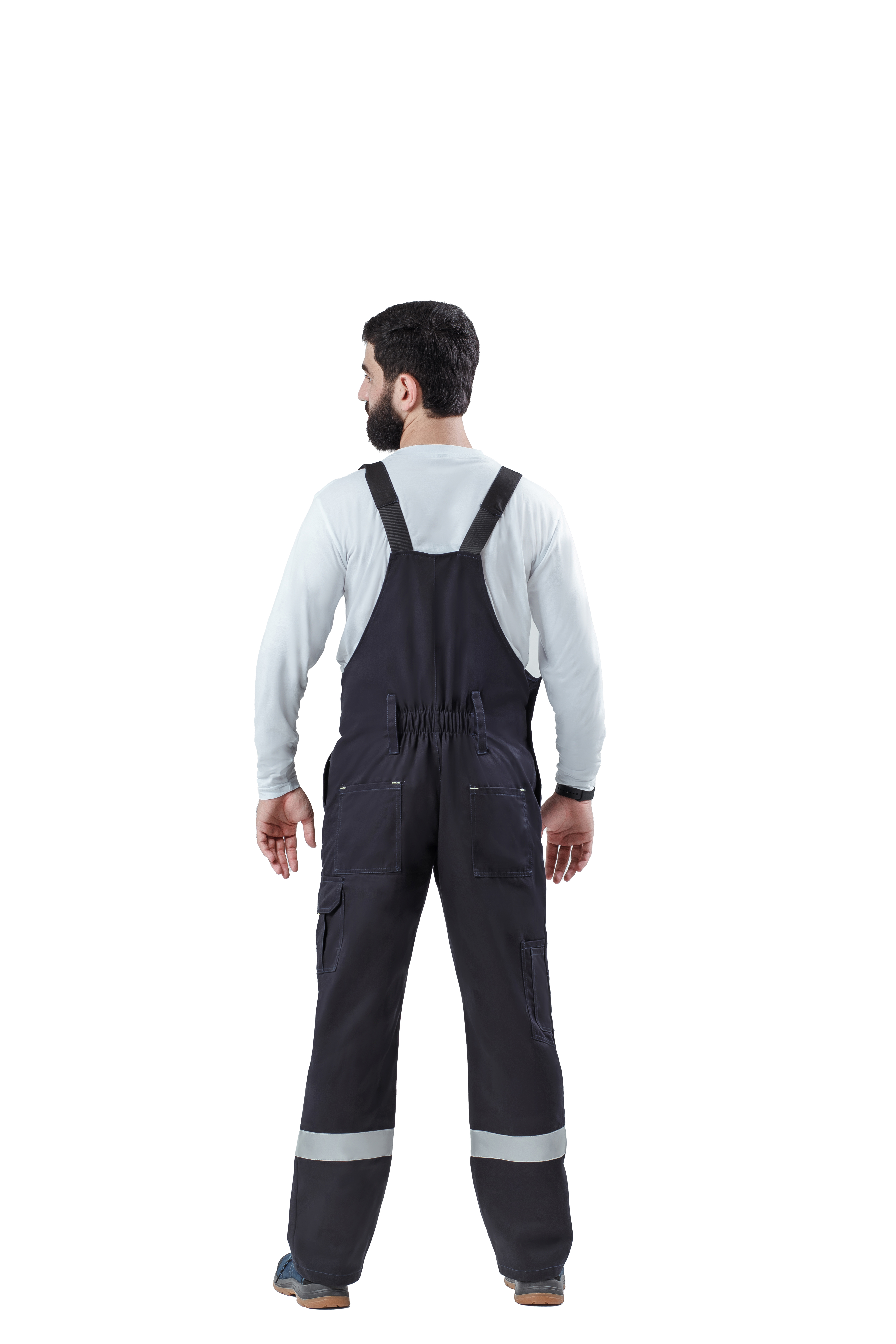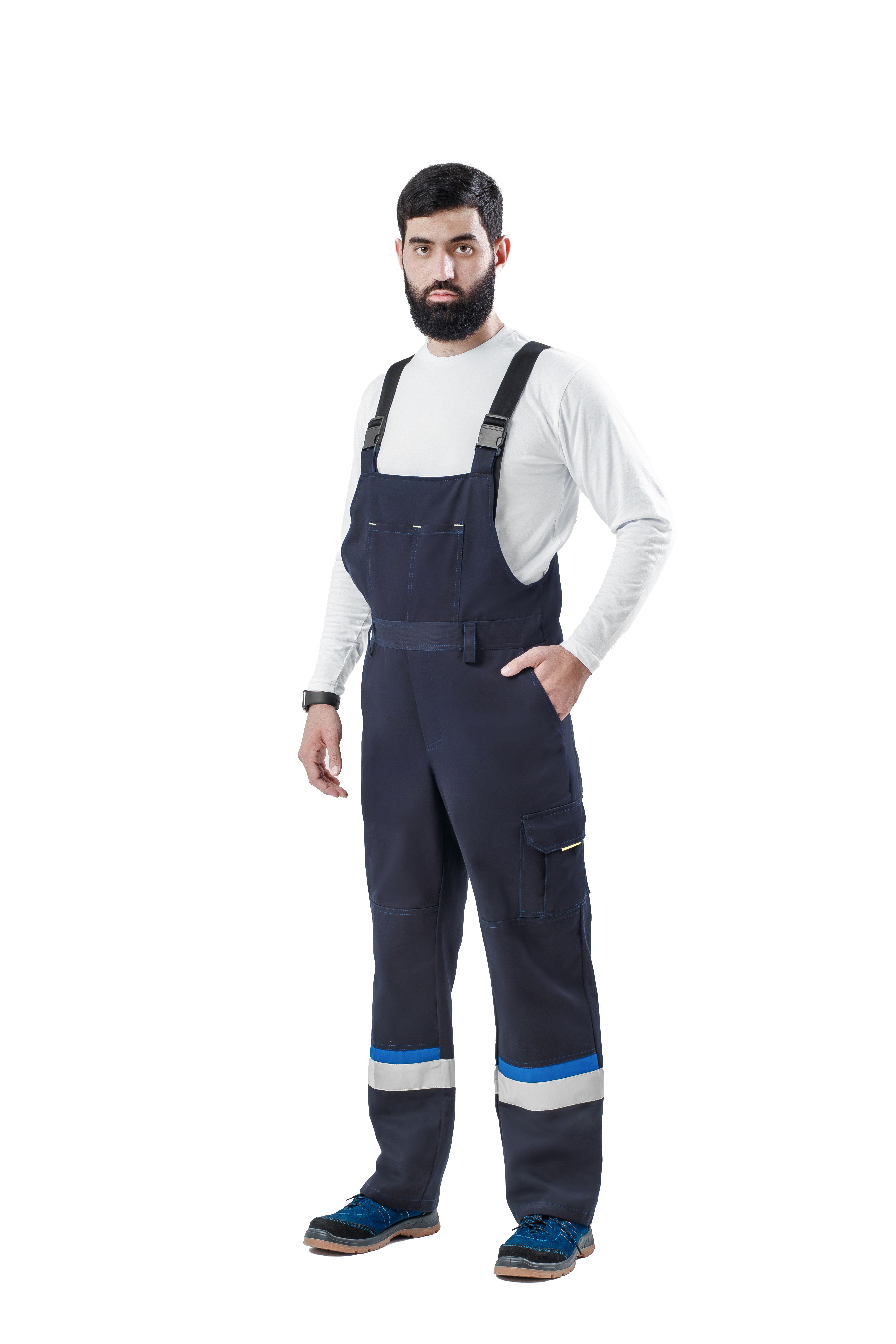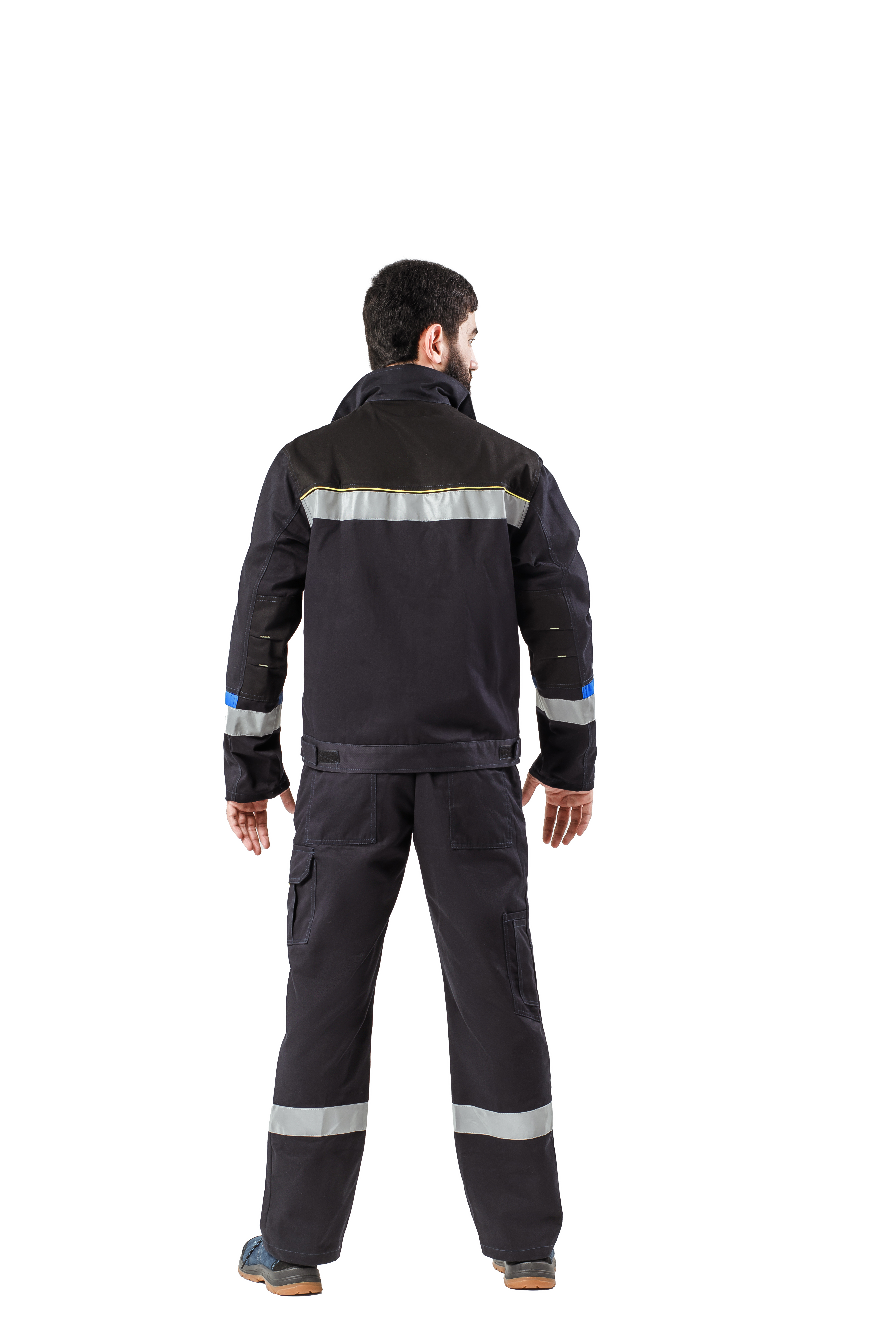- Костюм состоит из короткой куртки и полукомбинезона. Куртка прямого силуэта, короткая, с воротником стойка, с центральной застёжкой на тесьму-"молнию" накрытую ветрозащитным клапаном на липучках, с нижними прорезными карманами с листочкой, с притачным поясом регулирующимся по ширине при помощи хлястиков и липучки. Полукомбинезон с застёжкой гульфика и застёжкой в правом боковом шве на пуговицы, верхним накладным карманом и нижними внутренними боковыми карманами, с наколенниками, с накладным карманом на левом боковом шве с клапаном на липучке, с патой, с двумя задними и карманами для инструментов, по спинке вставлена резинка Товар поставляется под заказ