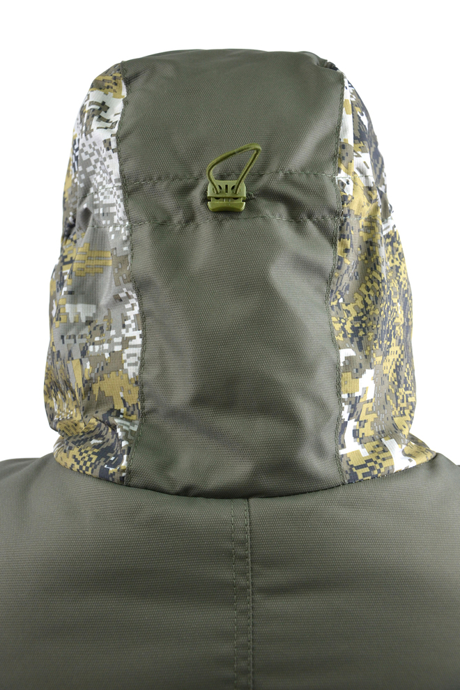 • капюшон двойной, с козырьком, имеет утягивающую кулису для регулировки по объему;