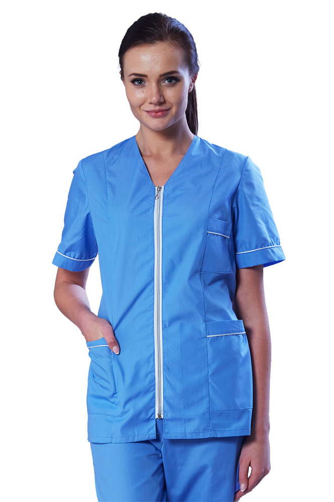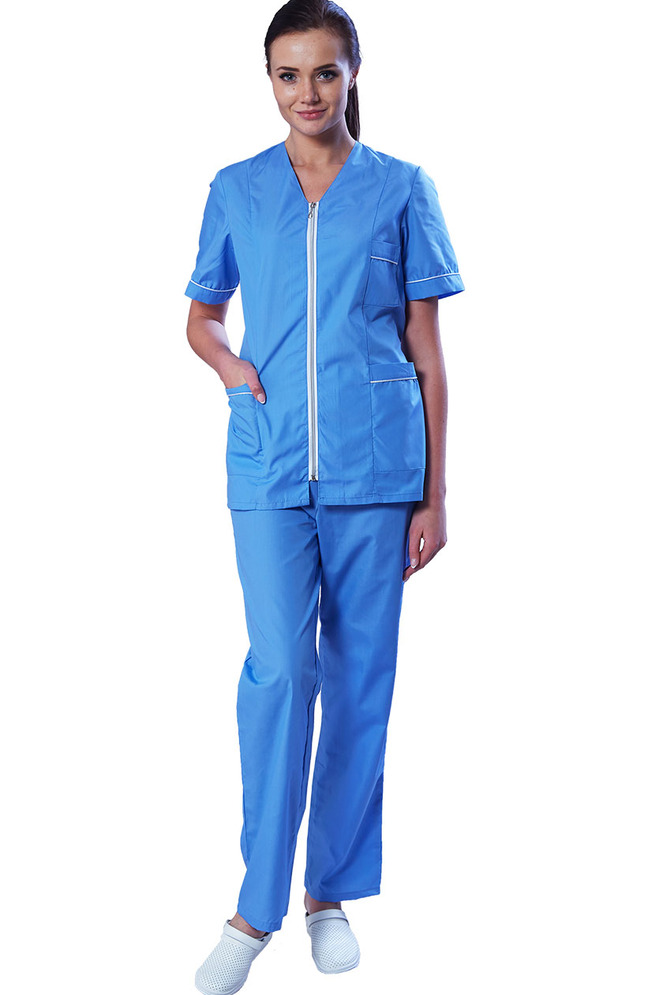 - -Блузка с V-образной горловиной -с центральной бортовой застежкой на молнию -Полочки с рельефами от линии плеча -с одним нагрудным и двумя нижними накладными карманами -Верхние срезы карманов обработаны обтачками -Спинка с хлястиком. -Рукава втачные одношовные, короткие, с отделочными манжетами -В швы настрачивания обтачек и отделочных манжет вставлен декоративный кант -Брюки с поясом на резинке -Позиция поставляется под заказ в количестве от 20 единиц -ЦЕНУ УТОЧНЯЙТЕ У МЕНЕДЖЕРА