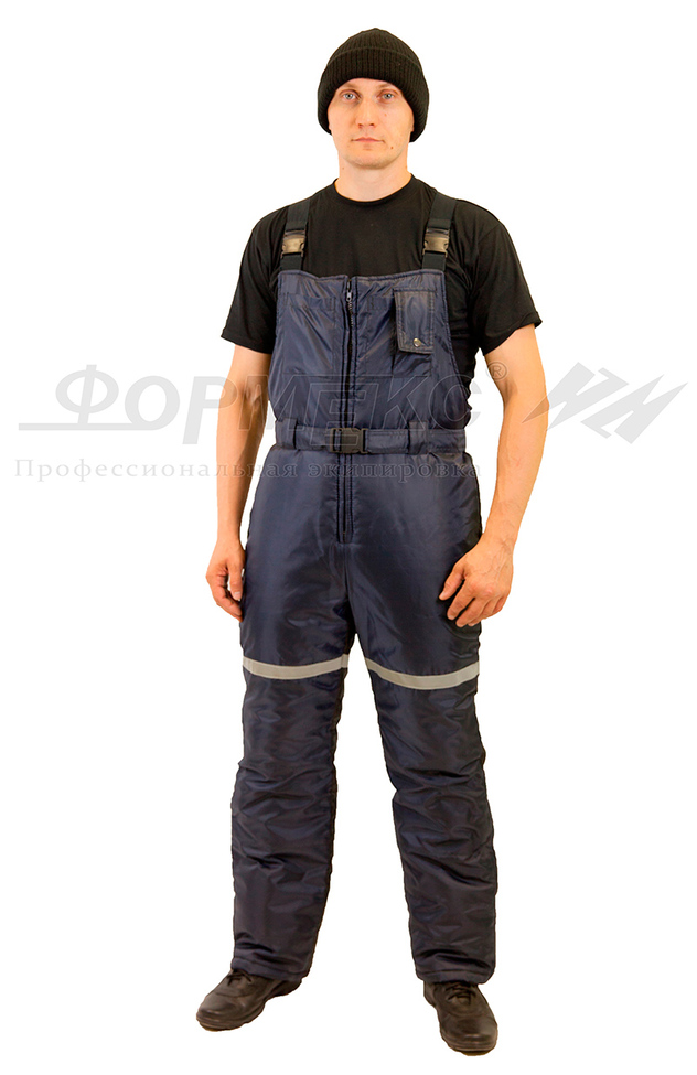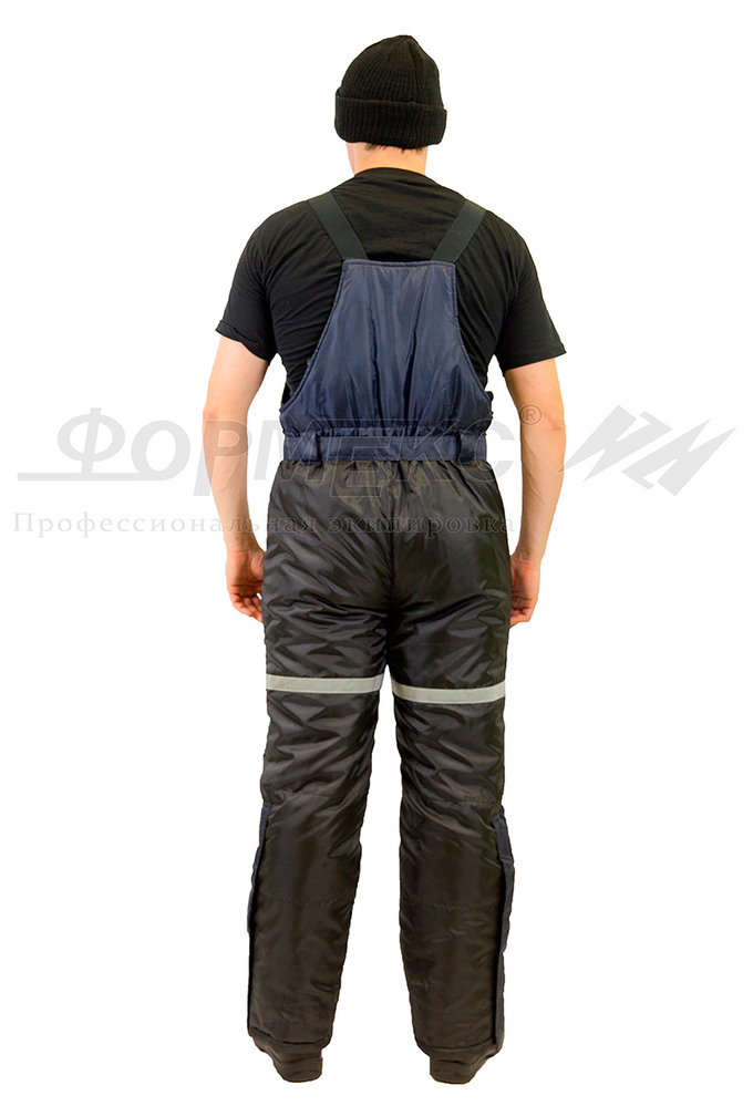 Спинка отрезная по линии талии-на эластичной ленте. Правая передняя половинка полукомбинезона с накладным карманом, левая-с двумя накладными карманами. Передние и задние половинки брюк – со свеоотражающей лентой. В поясе предусмотрен ремень,который регулируется за счет защелки-фастекс, Задние половинки брюк из отделочной ткани. Полукомбинезон на подкладке ; низ подкладки-с манжетами с застежкой на контактную ленту, нижний срез которых на эластичной ленте. Ткань верха-ткань курточная "Оксфорд" 240 Утеплитель-синтепон 250 гр/м. В поясе предусмотрен ремень, который регулируется за счет защелки-фастекс, -