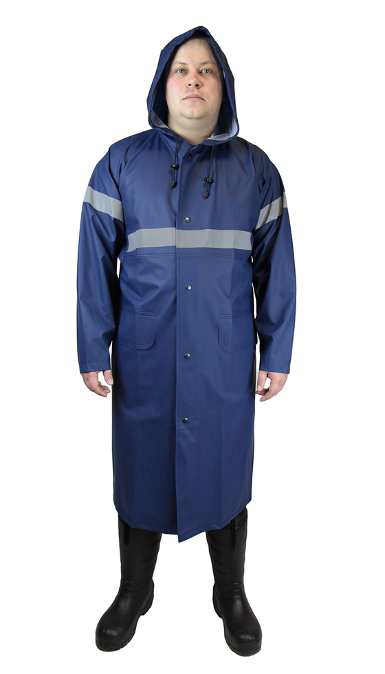 - Плащ из прочного, но при этом мягкого и эластичного материала на трикотажной основе с покрытием ПВХ плотностью 280г и толщиной 0.33мм, с герметичными сварными швами. Конструкция плаща, материал, из которого он изготовлен, и сварные швы обеспечивают защиту от воды, ветра, сырой нефти и нефтепродуктов. Благодаря морозостойкости материала плащ можно носить при низких температурах. Застежка на кнопки, боковые прорезные карманы с клапаном. Под кокеткой спинки - отверстия для вентиляции пододежного пространства, закрытые клапанами с перфорацией. Объем капюшона позволяет надевать его на каску, кнопка по низу рукава позволяет заузить рукав. Светоотражающие полосы по груди, спине и рукавам, позволяют быть заметным в темное время суток.Долговечный, герметичный,удобный плащ.