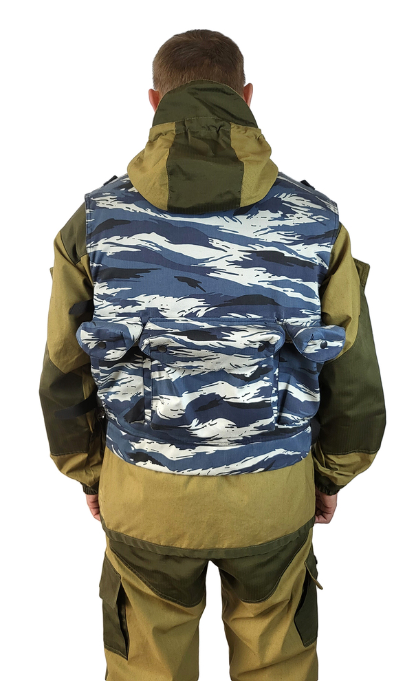 Передняя часть жилета: -4 кармана для двух магазинов АК каждый -5 карманов для ручных гранат -2 кармана для подствольных гранат по 4 шт. в каждый -ремень для навесного снаряжения Задняя часть жилета: -1 карман общего назначения (20смх18смх4см) -2 кармана общего назначения (9смх18смх4см) Жилет состоит из полочек и спинки, стачанных по плечевым швам и регулируемых по бокам с помощью пряжек ременными лентами. Полочки застегиваются по борту на тесьму-молнию и ветрозащитный клапан, застегивающийся на три кнопки. На полочки и спинку настрочены объемные карманы с клапанами. Жилет по низу регулируется с помощью прежек ременной лентой, продетой в притачную кулису по низу спинки. -