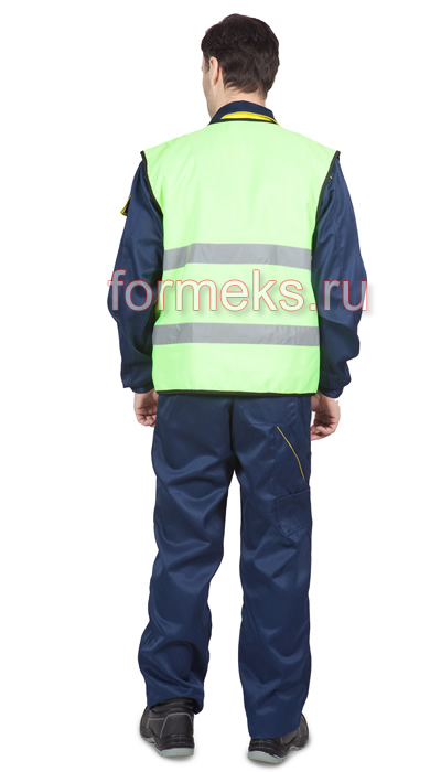 - Жилет сигнальный без боковых швов со светоотражающими полосами (5 см), расположенными на уровне груди и талии. Застежка-молния, спираль тип 5, с одним замком. Горловина, пройма, низ изделия-окантованы тесьмой черного цвета.