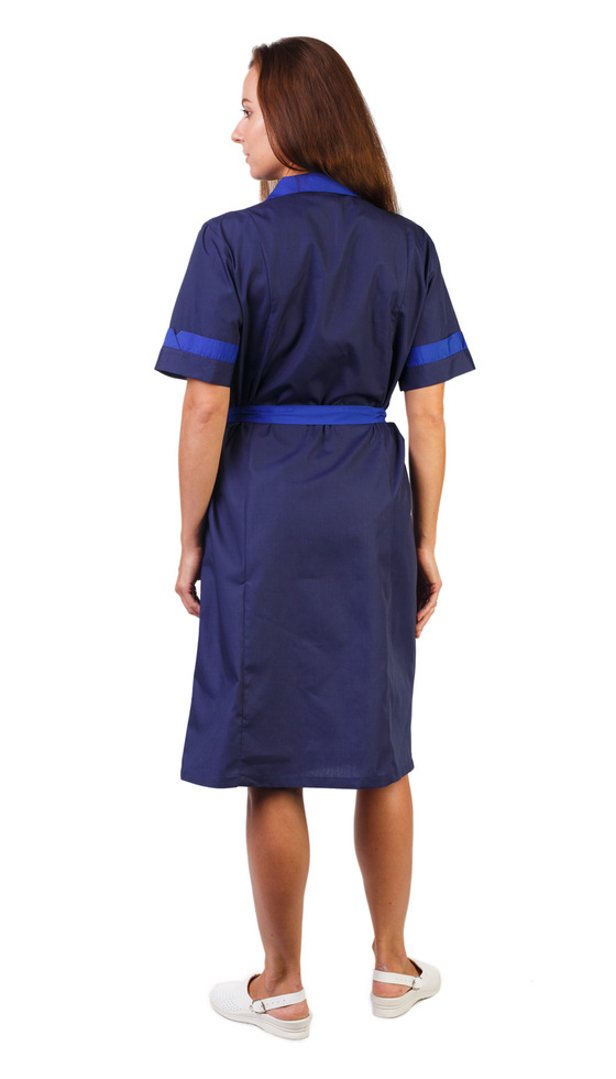 Халат прямого силуэта с застежкой на пуговицы, поясом, английским воротником, короткими рукавами, накладными карманами, контрастной отделкой.