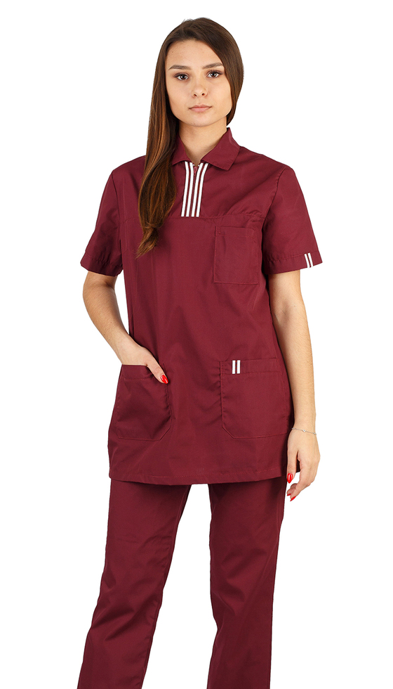 Блуза прямого силуэта с разрезами в боковых швах, застежка на «молнию» до горизонтальной кокетки и декоративной лентой, с отложным воротником, с верхним и нижними накладными карманами.