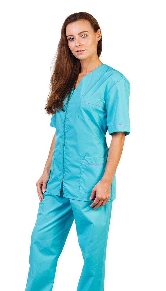 Блуза с застежкой на молнию, V-образным вырезом горловины, накладными карманами.