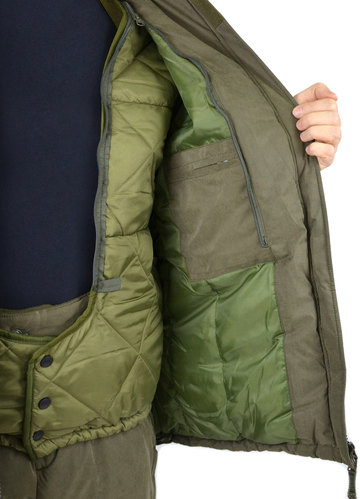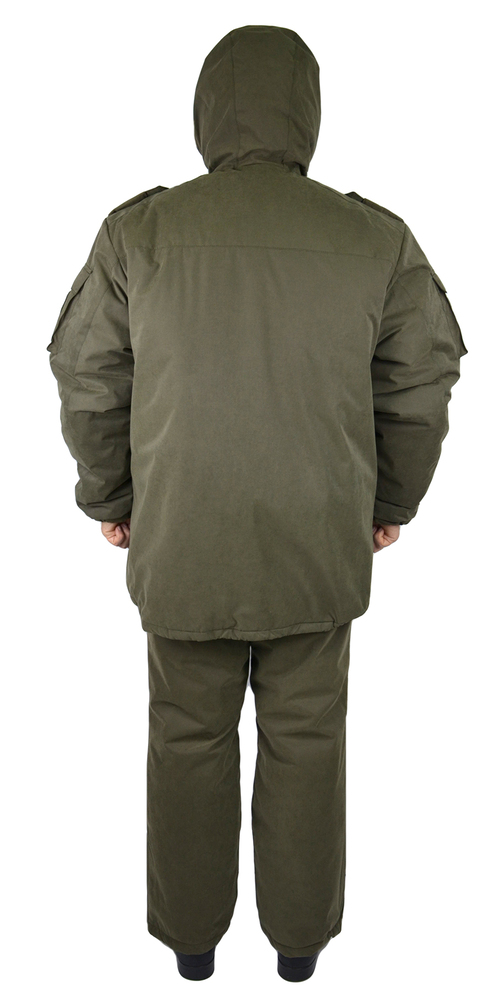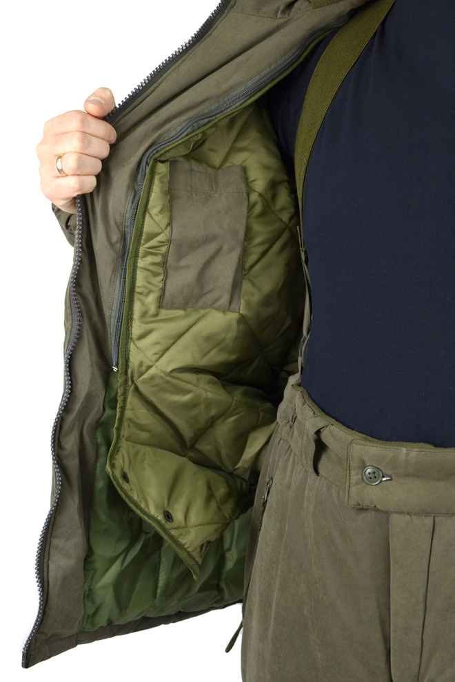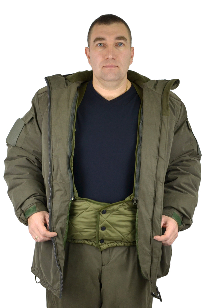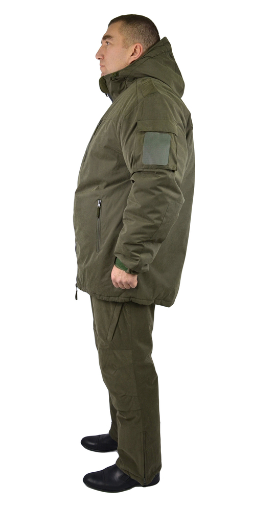 - Костюм состоит из куртки и брюк, съемного утеплителя для куртки и съемных бретелей. Куртка прямого силуэта на подкладке с капюшоном. Капюшон состоит из трех частей-центральной и двух боковых.Боковые части капюшона с двумя отверстиями на внешней стороне и фиксатором для его регулировки. На подкладке левой полочки куртки-накладной карман с планкой и застежкой "молния". Кокетка левой полочки с текстильной застежкой (сторона с петлями) для крепления нашивки съемной. Спинка с текстильной застежкой для крепления нашивки съемной.Рукава втачные двухшовные. В центре накладных карманов рукавов расположены текстильные застежки для крепления нарукавных знаков. Съемный утеплитель куртки состоит из полочек , спинки и рукавов. Полочки в нижней части с застежкой на три металлические кнопки. На подкладке левой полочки-накладной карман с планкой и застежкой " молния". На подкладке правой полочки- накладной карман с текстильной застежкой. Края бортов и горловины съемного утеплителя куртки с застежкой "молния" для пристегивания к куртке. Ткань курточная Токио BO ВУ3000 цв. хаки Ткань подклад. полиэстер арт.Taffeta 190T гладкокрашенная цв.хаки Полотное трикотажное флис полиэфирная односторонний 185 гр/м2. Утеплитель стеганый со спандбондом 200 гр./м2 +стежка 200 гр./м2 двусторонняя (тк+утеплитель+тк)