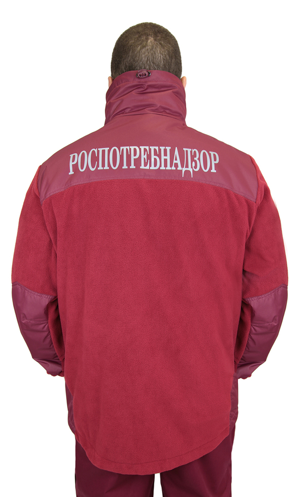 Куртка прямого покроя с центральной застежкой на молнию, с втачным рукавом, с воротником-стойкой из трикотажного разворсованного полотна флис, поверхностной плотностью 250-300 гр/м². Накладные детали выполнени из ткани полиэфирной с пленочным покрытием, бордового цвета. Полочки куртки с отрезной кокеткой. На левой кокетке расположен наклонный прорезной карман в «рамку» с листочкой на молнии. Нижняя часть полочки с отрезным бочком, с двумя боковыми карманами на молнии, расположенными в швах соединения деталей нижних частей полочек. На боковых швах куртки по низу, настрочены усилительные накладки из полиэфирной ткани. На полочках настрочены текстильные застежки, предназначенные для крепления нагрудных знаков: на левой - Ф.И.О., на правой - «РОСПОТРЕБНАДЗОР». Размер текстильной застежки 120х25 мм. Подкладка верхних и нижних боковых карманов, выполнена из трикотажного филейного полотна - сетки. Полочки куртки на подкладке из сетки. Спинка с настрочной кокеткой. На кокетке нанесена «РОСПОТРЕБНАДЗОР» методом термопечати светоотражающими элементами. Рукава втачные одношовные, с настрочной локтевой накладкой. Нижний срез рукавов с цельнокроеной обтачкой, стянут на эластичную тесьму. На левом рукаве настрочен, установленные для Роспотребнадзора, нарукавный знак на расстоянии 80 мм от шва втачивания рукава. Воротник–стойка по отлету регулируется по длине с помощью эластичного шнура, выведенного через люверсы, и двойного фиксатора. Кокетка спинки, кокетки полочек, верхняя стойка воротника, локтевая часть рукавов и усилительные боковые накладки из полиэфирной ткани. В верхней части бортовой застежки втачан ветрозащитный клапан. Низ куртки обработан обтачкой из полиэфирной ткани. Ширина куртки по низу регулируется с помощью эластичного шнура, выведенного через люверсы, и двойных фиксаторов, закрепленных на боковых швах куртки изнутри с помощью петли из прикладной тесьмы для вешалок. По вытачкам на усилительных накладках рукавов, прорезному карману кокетки - отделочная строчка на 0,2 см от шва. По кокеткам полочек и спинки, боковой и локтевой накладке - отделочная строчка на расстоянии на 0,2 и 0,7 см от края детали. По рельефам полочки и швам втачивания рукавов, по ветрозащитному клапану, по краю борта, отделочная строчка на расстоянии 0,5-0,7 см от шва или края детали. По отлету воротника и нижнем карманам полочки - отделочная строчка на расстоянии 2,0-2,5 см от края. Низ куртки отстрочен на расстоянии 3,0 см от края. -