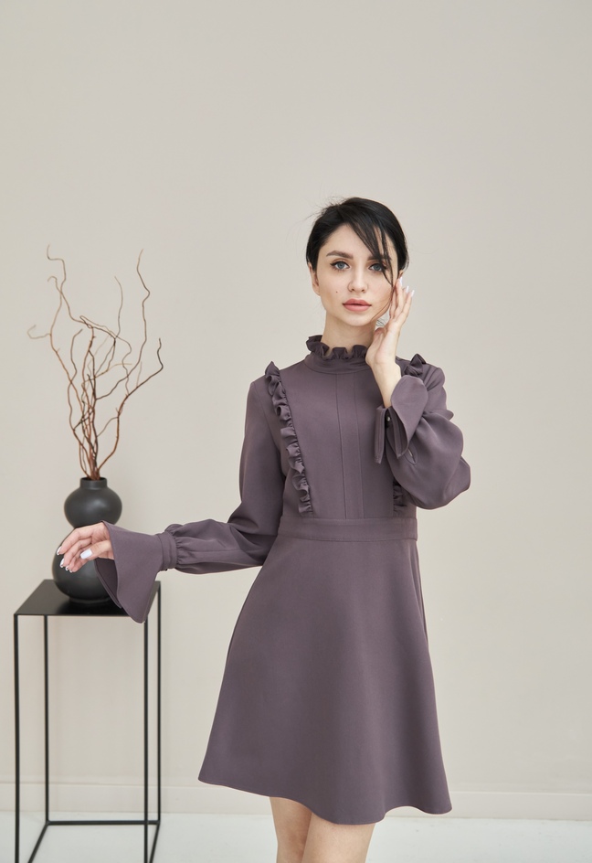 - Приталенное мини-платье от российского бренда MARIMAR. Эффектное платье с рюшами в зоне декольте, что придает кокетливости образу. Элегантные длинные рукава застегиваются на пуговицу. Выполнено из приятной на ощупь плотной ткани. Благодаря особенностям кроя, платье струится подчеркивая фигуру. Цвет меняется от нежно-сиреневого до теплого коричневого, зависит от освещения. Размер на модели: S Рост модели: 167 см. Модель универсальна. Подойдет как для повседневной жизни, так и для особых случаев. Состав: 87% полиэфир, 13% эластан