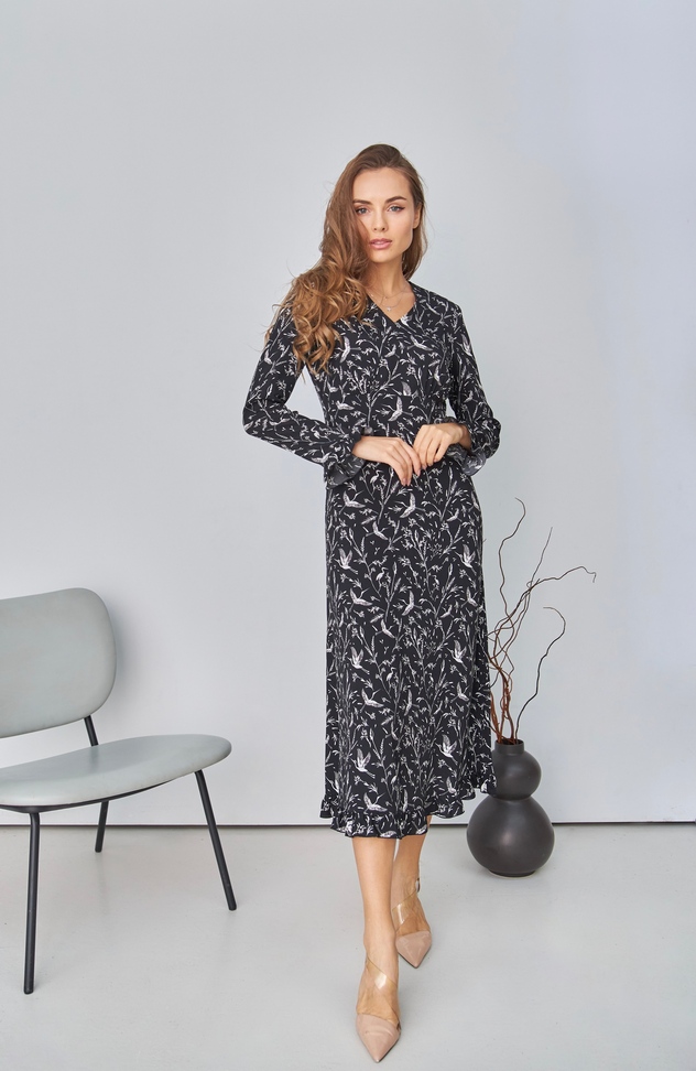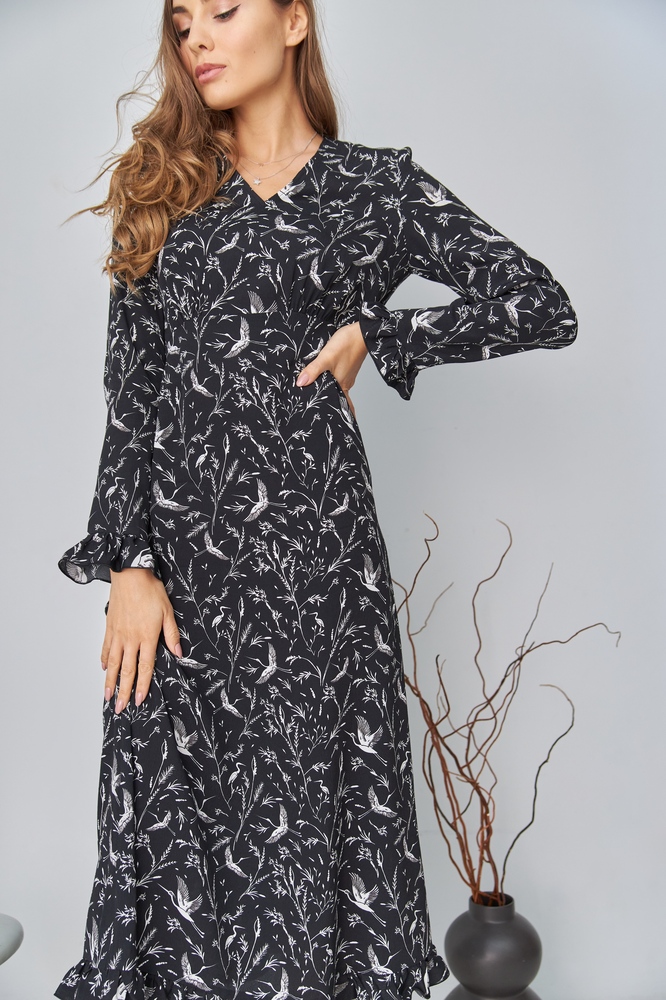 - Длинное платье от российского бренда MARIMAR. Выполнено из качественной итальянской ткани (100% вискоза). Платье черного цвета с цветным принтом "птицы". Декорировано оборками по низу платья и рукавам. Для удобства эксплуатации в боковом шве предусмотрена потайная застежка молния. Струится по фигуре подчеркивая достоинства. Идеально подойдет для любых мероприятий. Хорошо смотрится как с классической обувью, так и с ботинками. Размер на модели: XS Состав: 100% вискоза