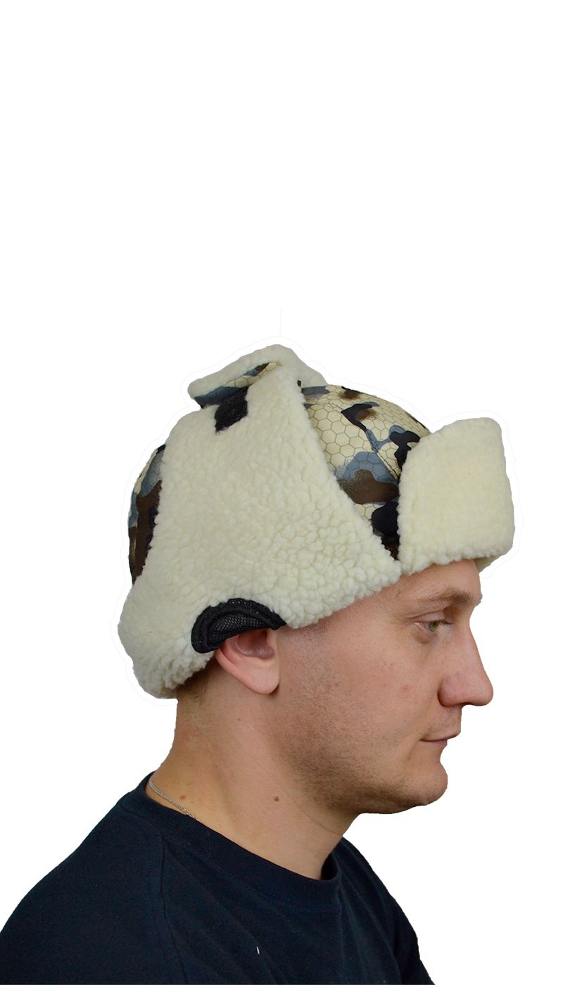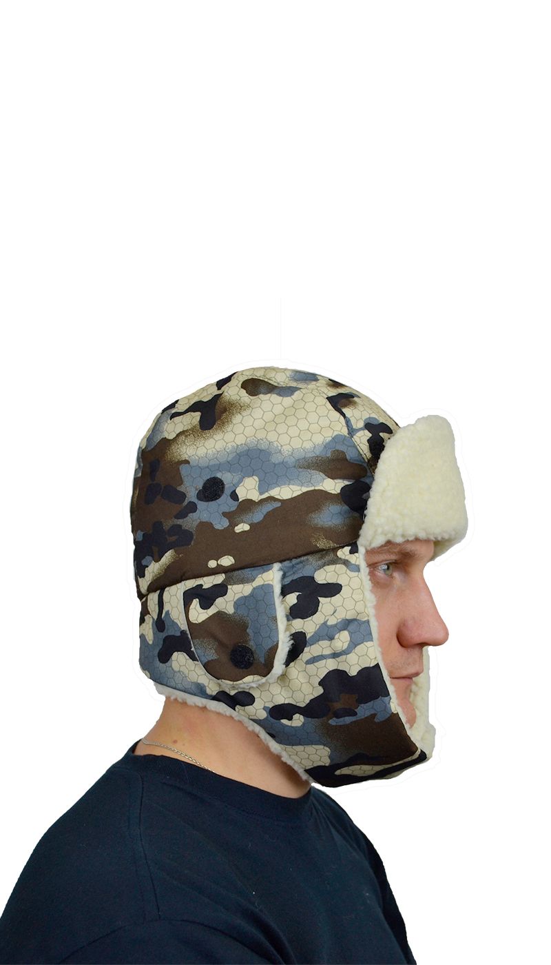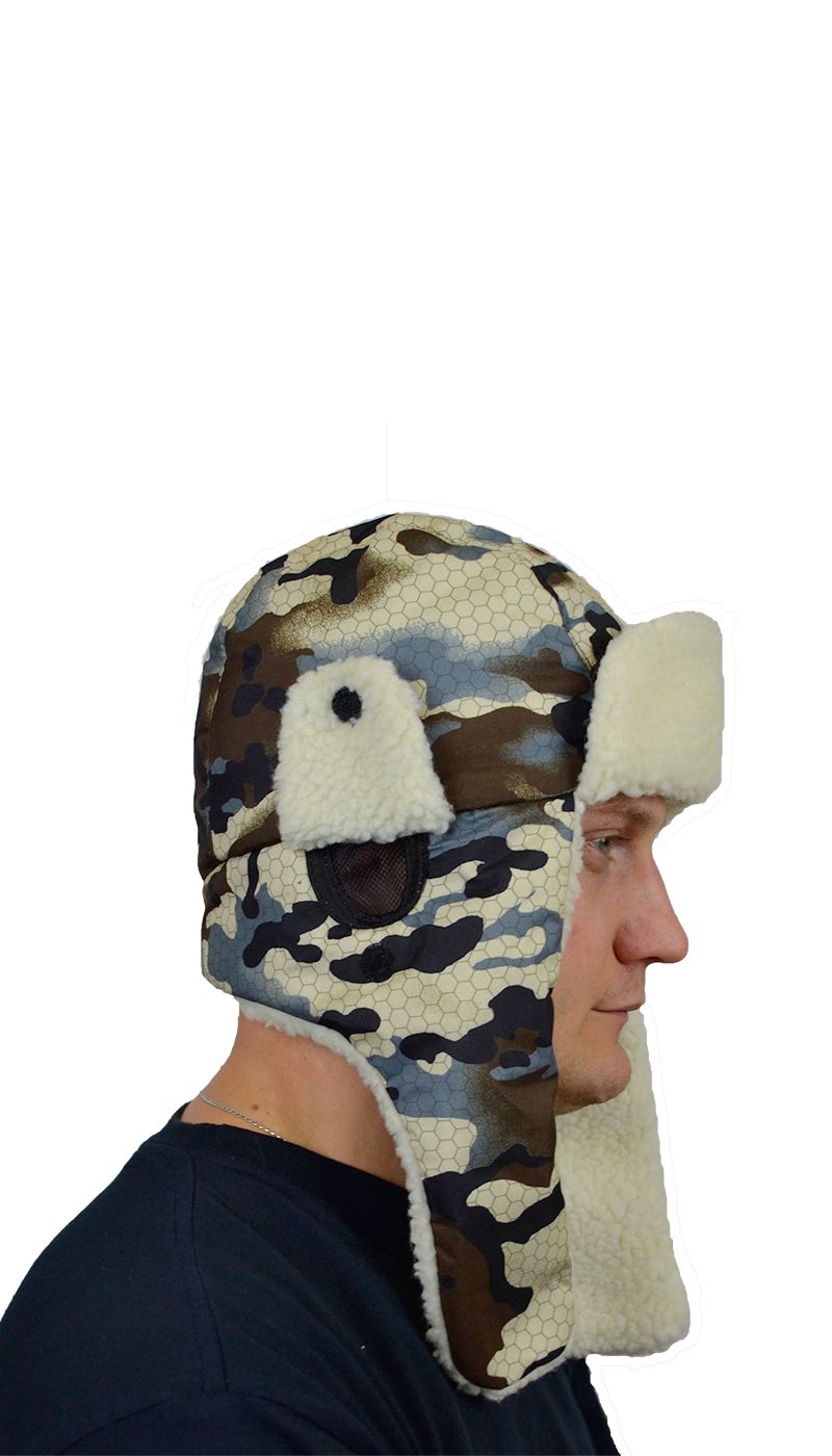 - Шапка утепленная камуфлированной расцветки, на флисовой подкладке, состоит из головки, козырька и назатыльника цельнокроеного с наушниками. Головка из двух центральных и двух боковых деталей. На наушниках расположены слуховые отверстия , сверху над ними в шов соединения головки с назатыльником втачаны ветрозащитные клапаны. В слуховые отверстия вставлено трикотажное полотно – сетка. Для фиксации ветрозащитных клапанов и козырька настрочена текстильная застежка. Лицевые детали козырька, назатыльника с наушниками, подлицевые детали клапанов – из искусственного меха. Головка, подлицевые детали козырька, назатыльника с наушниками, лицевые детали клапанов – из ткани. Подкладка шапки состоит из двух центральных деталей и двух боковых деталей.