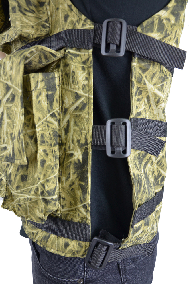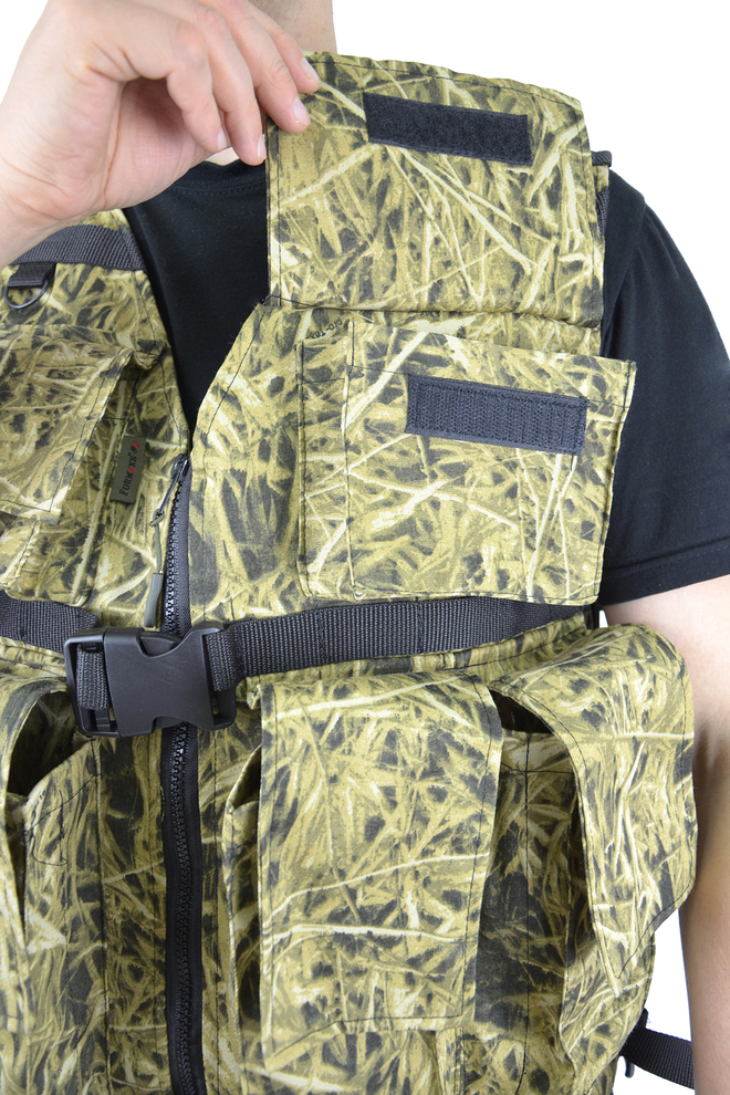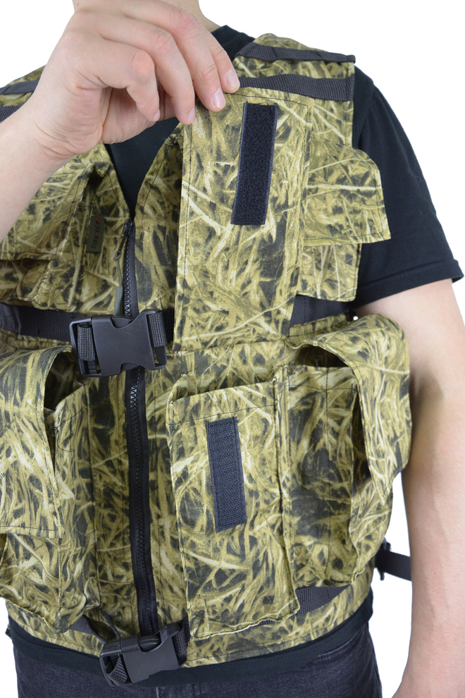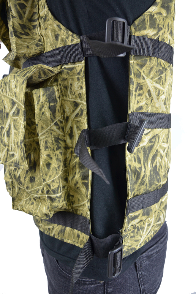 - Жилет-разгрузка Жилет состоит из полочек и спинки, стачанных по плечевым швам и регулируемых по бокам с помощью пряжек ременными лентами. Полочки застегиваются по борту на тесьму-молнию На полочки настрочены объемные карманы с клапанами. Жилет по низу регулируется с помощью пряжек ременной лентой, продетой в притачную кулису по низу спинки. Регулируется по размеру от 44 до 58 Описание карманов: 2 одинарных накладных кармана в области груди размеры накладного кармана в области груди: длина-10 см; ширина-13 см; глубина-4,5 см размеры клапана накладного кармана в области груди: длина-11 см; ширина-16 см 4 двойных накладных кармана расположенных по нижней части жилета размеры двойного накладного кармана расположенного по нижней части жилета: длина-20 см; ширина-9 см; общая глубина-6 см (глубина каждого кармана 3см. )